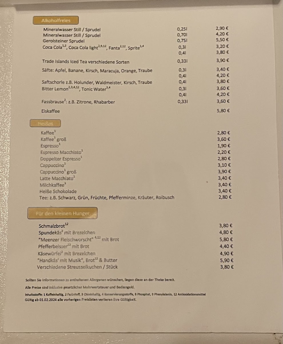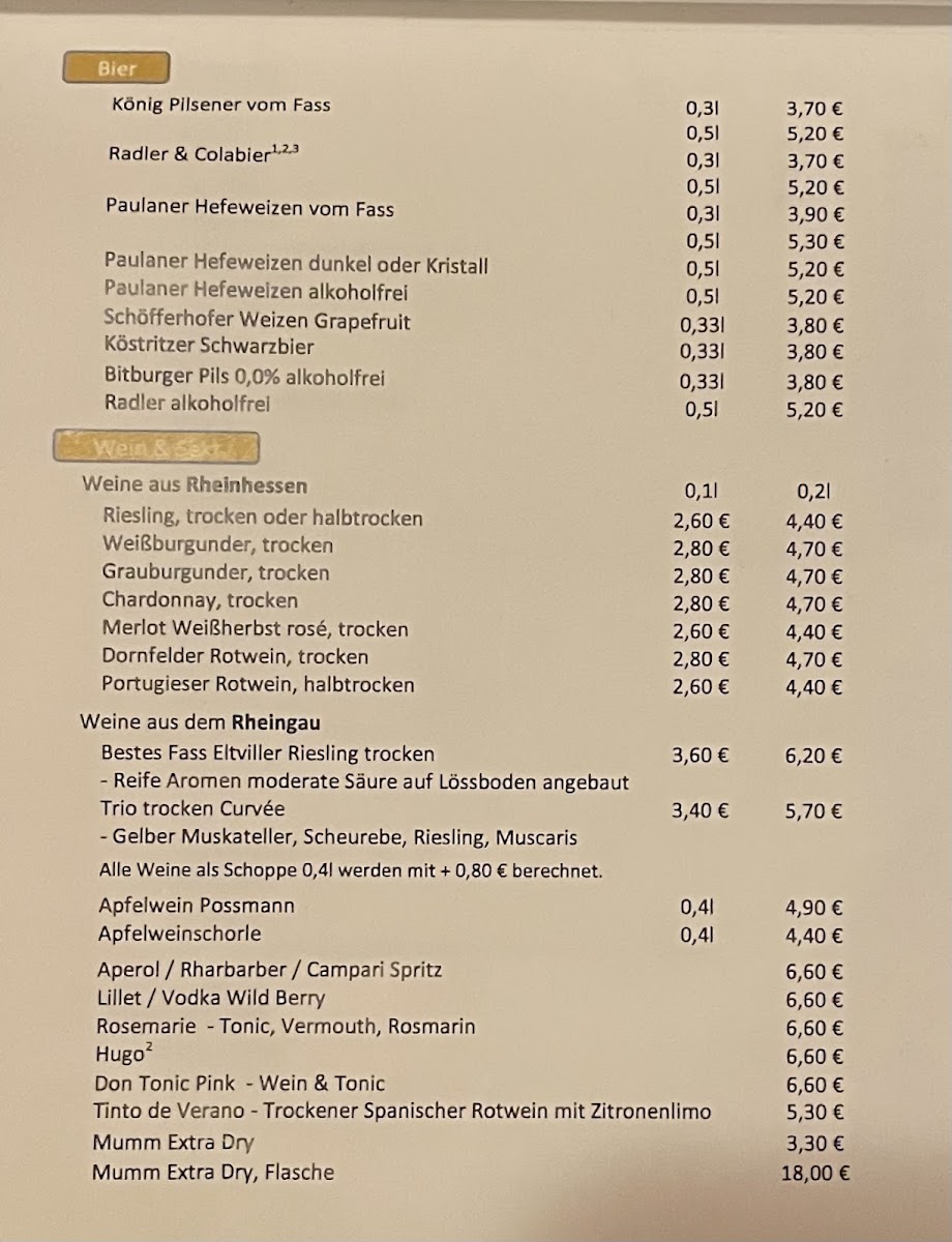 The drink menu offers a range of options suitable for different tastes and budgets. As Laura Rampersad points out, it’s a great place to sample local wines, while Lily L. recommends indulging in “Kaffe und Kuchen” – the cherry cake and grapefruit beer here are standout choices that should not be missed. The prices are informationally displayed, ensuring there are options for both those seeking a casual outing or a more upscale experience.